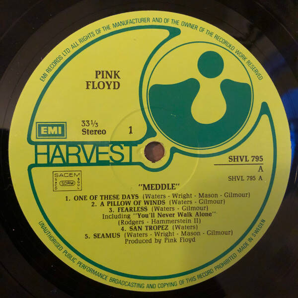 SACEM SDRM SACD SGDL-rettighetslogo på begge etikett sider. «Made in Sweden» av EMI på etikettene.